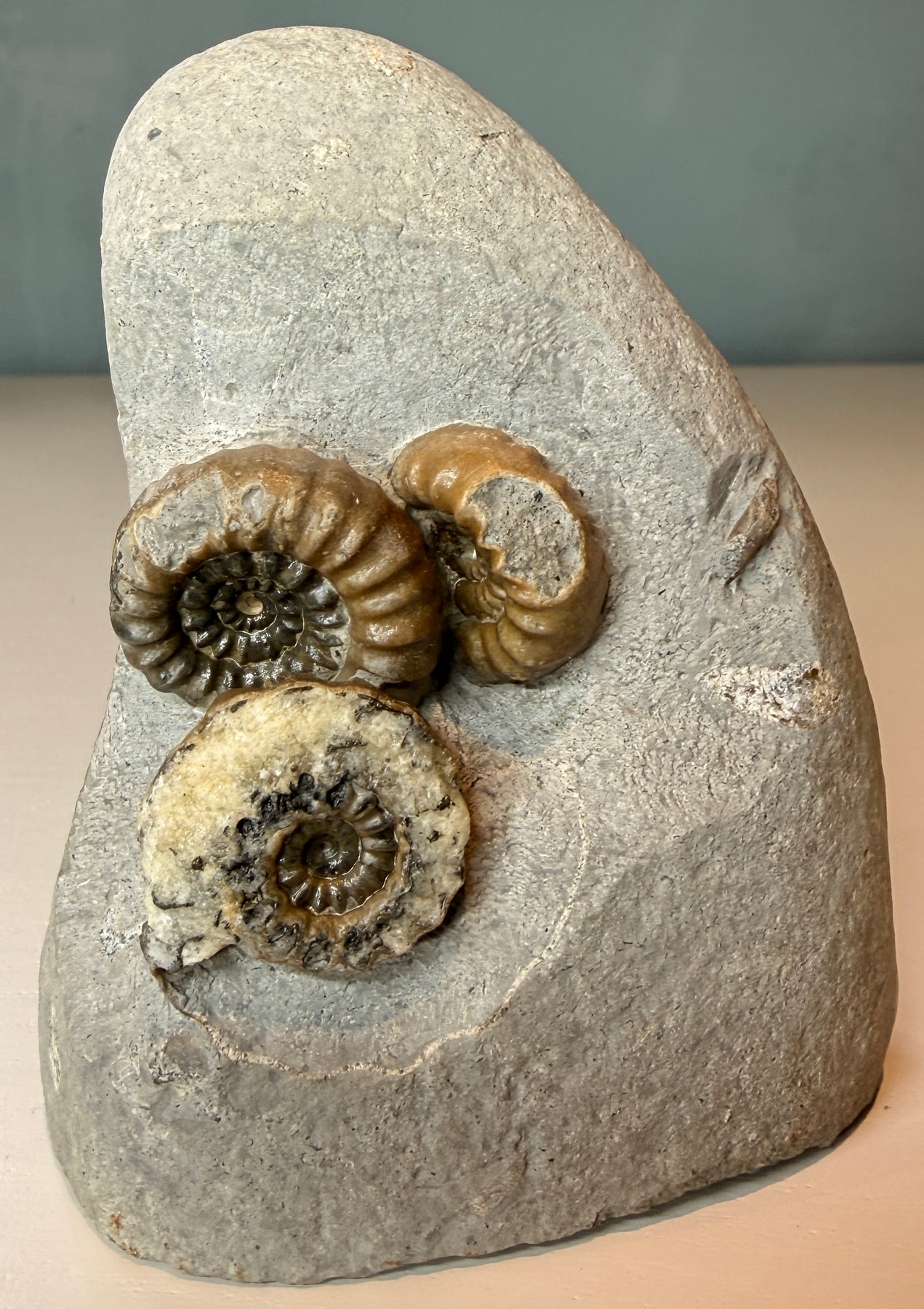 Free standing & on a cut base. This is a less common ammonite! Three in a cluster. From Belenmite stone Weight 620g. Postage included for mainland UK customers.