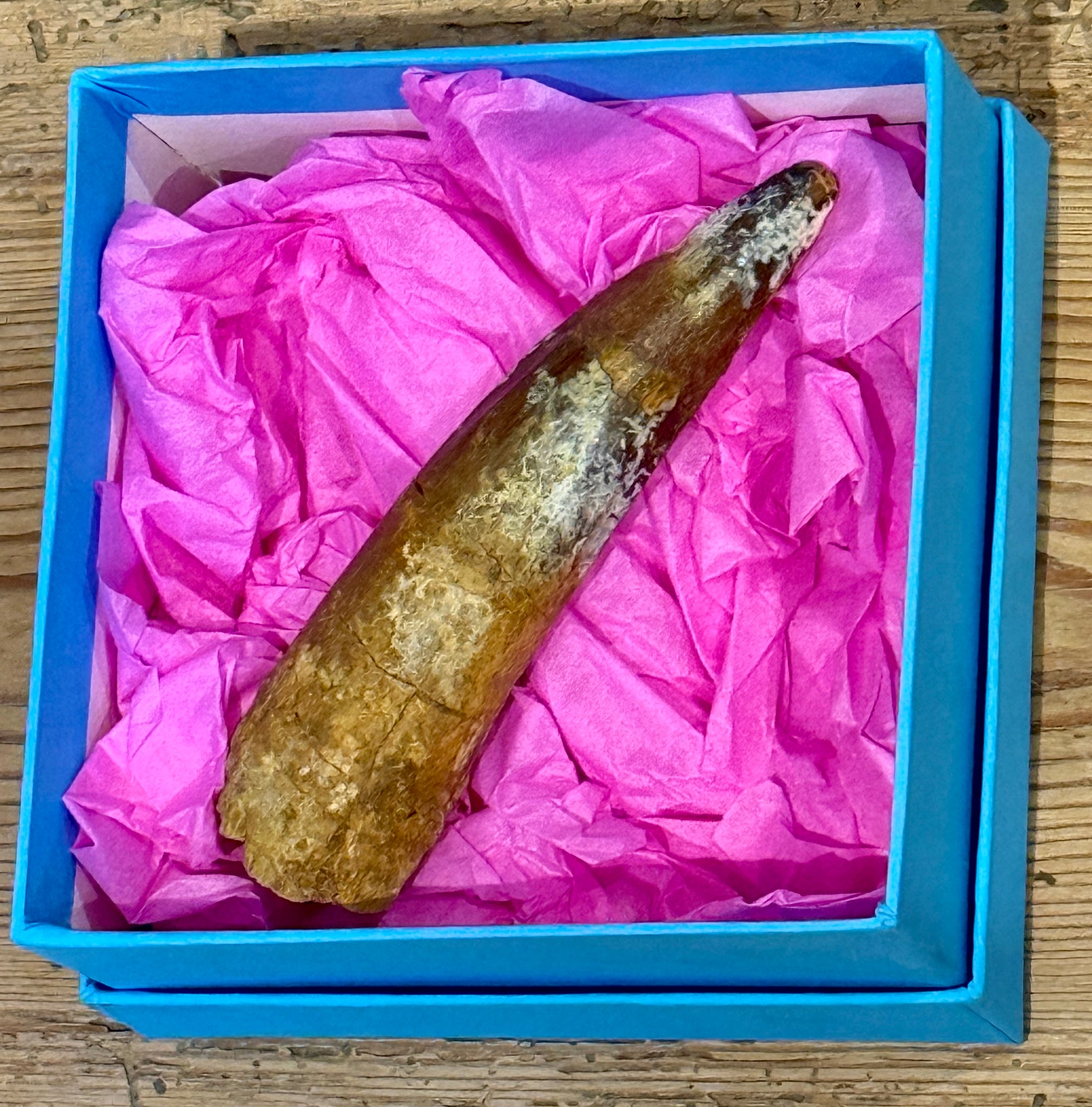 Has had some repair, but a very nice tooth, this Spinosaur tooth, comes with a presentation box. Kem Kem bed. Has been repaired. Approx 60g. Postage included for mainland UK customers.