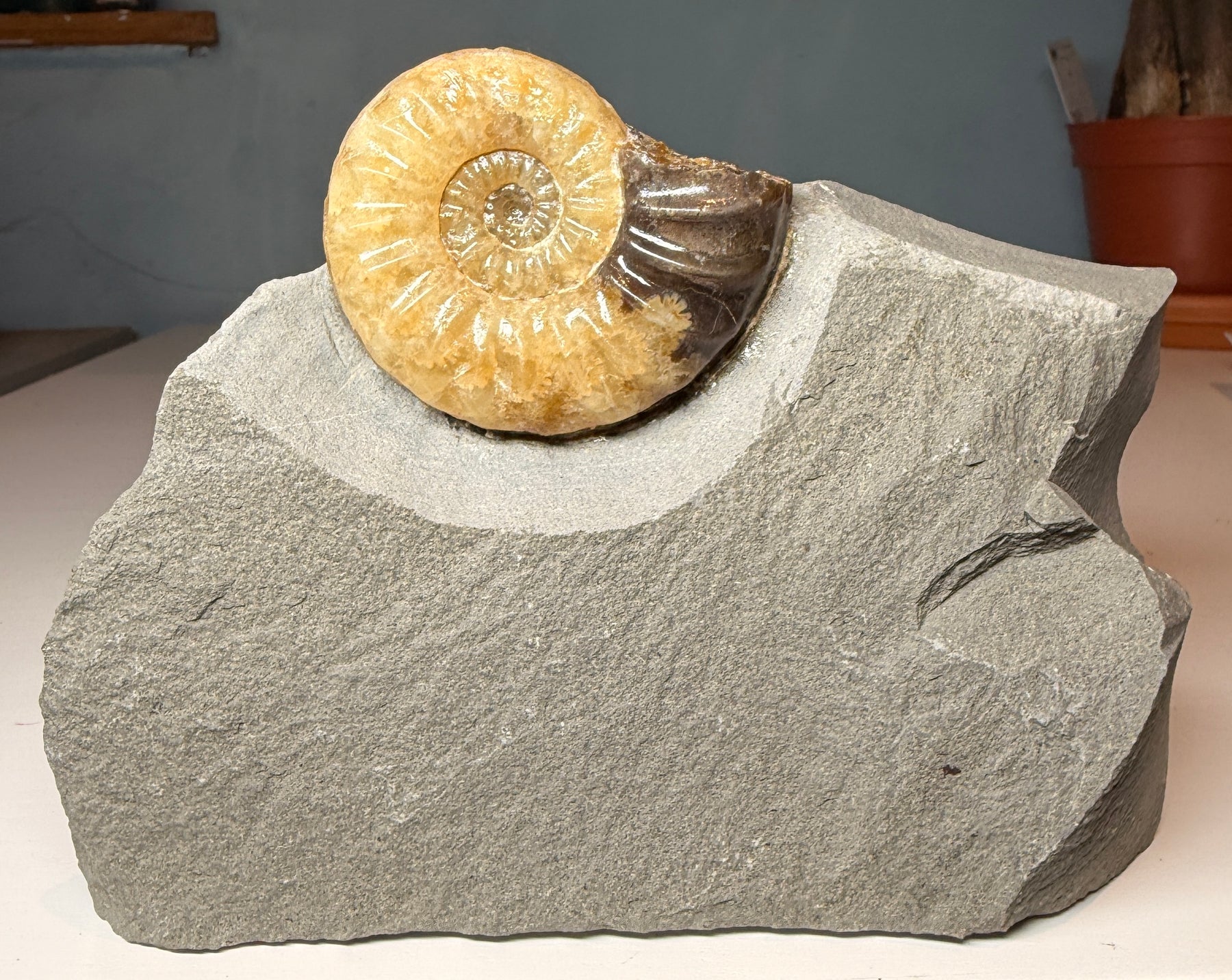 Free standing & on a cut base. This is a lovely example of one of our local ammonites species, Asteroceras. Weight 1kg. Postage included for mainland UK customers.