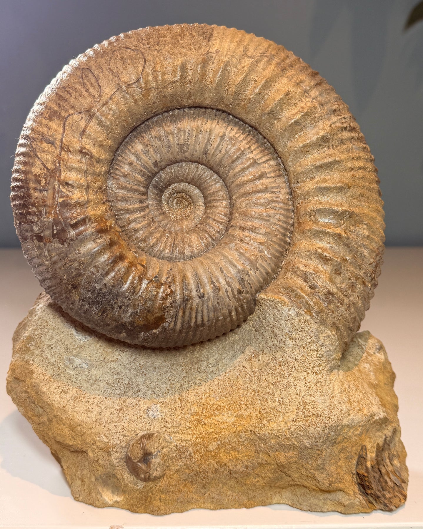 A lovely example Stephanoceras, on a cut base, & free standing. A great display piece. Found by Tony & prepared by Kayleigh. Parkinsonia ammonite. Weight. 4.3kg. Postage  included  for mainland UK customers.